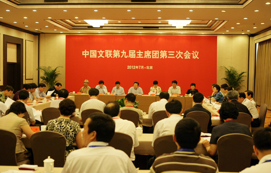 7月5日,中國文聯第九屆全國委員會第三次會議在京召開。全國政協副主席、中國文聯主席孫家正主持會議。中國文聯黨組書記、副主席趙實,中國文聯黨組副書記、副主席覃志剛、李屹,中國文聯黨組成員、副主席楊承志,中國文聯黨組成員左中一,中國文聯黨組成員、書記處書記夏潮,中組部干部三局巡視員、副局長趙凡,中宣部文藝局巡視員、副局長孟祥林,中國文聯副主席丹增、馮遠、邊發吉、劉蘭芳、李雪健、李維康、陳曉光、迪麗娜爾·阿布都拉、趙化勇、段成桂、徐沛東、奚美娟、黎國如和中國文聯主席團委員、全委會委員出席會議。中組部、中宣部有關部門負責同志,有關全國文藝家協會主席,中國人民銀行文聯負責同志,有關全國文藝家協會、中國文聯有關機關部室和直屬單位負責同志列席會議。
