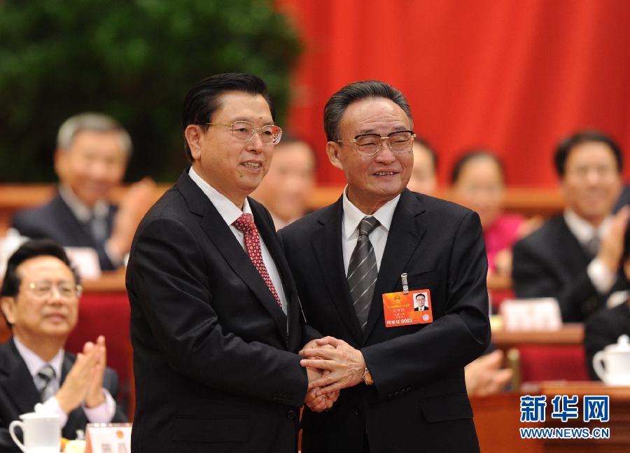 3月14日,十二屆全國(guó)人大一次會(huì)議在北京人民大會(huì)堂舉行第四次全體會(huì)議,選舉第十二屆全國(guó)人民代表大會(huì)常務(wù)委員會(huì)委員長(zhǎng)、副委員長(zhǎng)、秘書(shū)長(zhǎng);選舉第十二屆全國(guó)人民代表大會(huì)常務(wù)委員會(huì)委員;選舉中華人民共和國(guó)主席、副主席;選舉中華人民共和國(guó)中央軍事委員會(huì)主席。張德江當(dāng)選第十二屆全國(guó)人民代表大會(huì)常務(wù)委員會(huì)委員長(zhǎng)。這是吳邦國(guó)與張德江握手。 新華社記者謝環(huán)馳攝