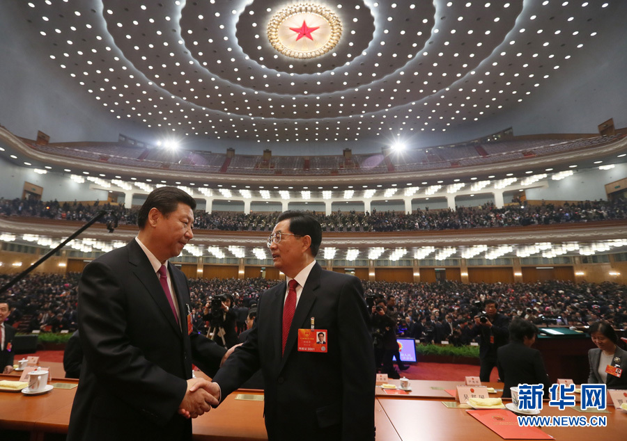3月17日,第十二屆全國(guó)人民代表大會(huì)第一次會(huì)議在北京人民大會(huì)堂舉行閉幕會(huì)。這是習(xí)近平與胡錦濤親切握手。新華社記者 蘭紅光攝