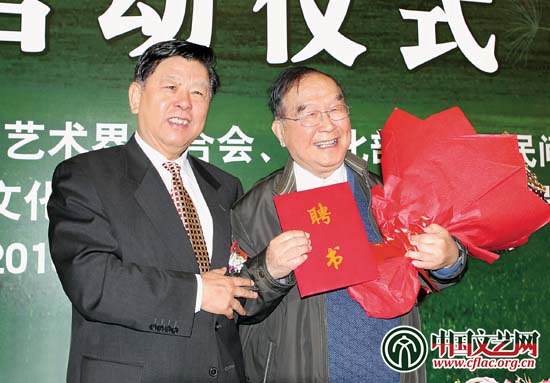 周巍峙、胡振民啟動中國口頭文學(xué)遺產(chǎn)數(shù)字化工程。胡振民為中國口頭文學(xué)遺產(chǎn)數(shù)字化工程工作委員會名譽顧問周巍峙頒發(fā)聘書。
