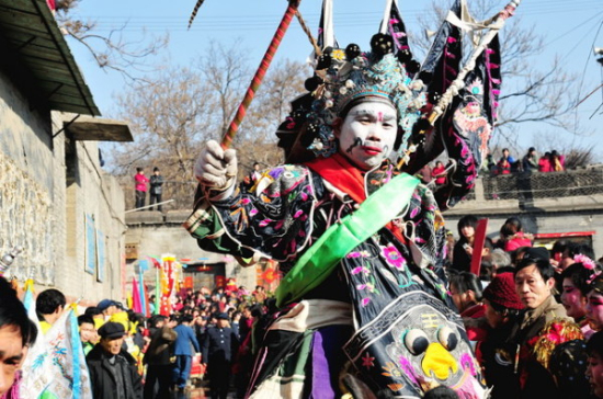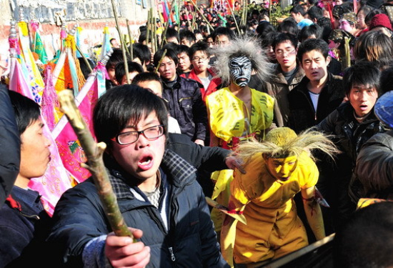王曉培說,雖然正月十五的氣溫還很低,但是“大鬼”、“二鬼”和“跳鬼”卻要身著單衣,走到街上面目猙獰地擺弄出勇猛無畏的姿態,驅邪捉“黃鬼”。“黃鬼”全身和頭發都被涂滿黃色染料,四處逃竄。村民們舉著樹枝和木棍,隨著三個“鬼差”追鬼和打鬼。黃鬼在最后得到嚴懲,也象征著人類戰勝了邪惡、災難和疾病。在表演“捉黃鬼”時,“財神”、“土地爺”、“城隍”等角色也會紛紛“亮相”向“玉皇大帝”跪拜祈福。