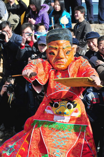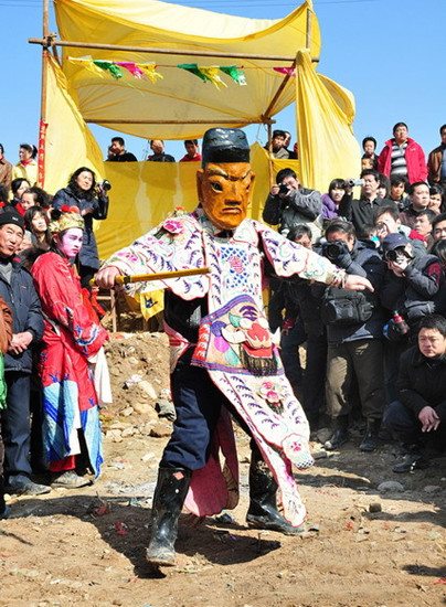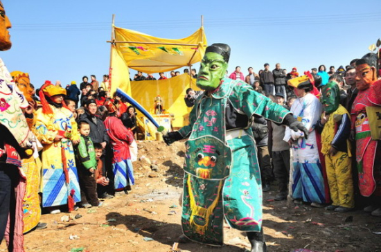 黃鬼被擒,吉祥如意。村里表演隊伍開始慶祝,旱船、秧歌、舞獅子,各式花車齊上陣。最后,黃鬼押上斬鬼臺時,群情激奮,禮炮震天。透過彌漫的煙霧,黃鬼被就地正法,鮮血噴濺,象征著人類對邪惡的勝利。這成為整個活動的高潮。黃鬼被斬后,儺戲就在村中的老戲臺上演。