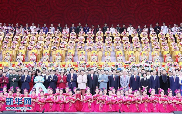 9月29日,慶祝中華人民共和國成立70周年大型文藝晚會《奮斗吧 中華兒女》在北京人民大會堂舉行。習近平、李克強、栗戰書、汪洋、王滬寧、趙樂際、韓正、王岐山等黨和國家領導人同4000多名觀眾一起觀看演出。演出結束后,習近平等走上舞臺同演職人員合影留念。新華社記者王曄攝