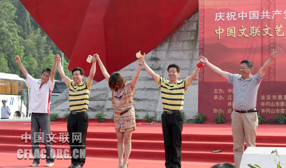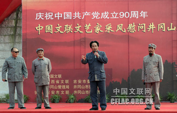 “巍巍井岡,連接著中國共產黨艱辛而又輝煌的歷史;光榮井岡,寫滿中國人民偉大復興的夢想。為喜迎中國共產黨成立90周年,按照中央的要求和中國文聯的部署,今天,我們組織部分知名文藝家專程來到井岡山,開展走訪、采風、慰問活動,目的是重溫黨的光榮歷史,弘揚黨的優良傳統;向英雄的革命老區人民學習,接受革命傳統教育;通過藝術實踐把黨和政府的關懷送到革命老區、送到基層一線?!痹?月13日于井岡山舉行的中國文聯文藝家采風慰問“井岡山革命老區行”慰問演出現場,中國文聯黨組書記趙實在致辭中道出了此次活動的目的。