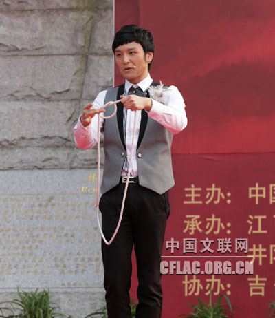 5月13日至14日,中國文聯文藝家采風慰問井岡山革命老區行活動在革命圣地井岡山隆重舉行。圖為傅琰東表演魔術。中國文聯網 郭青劍 攝