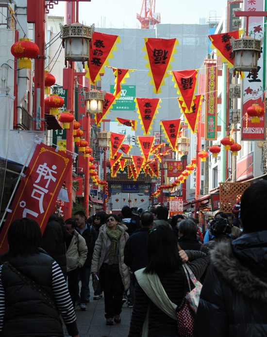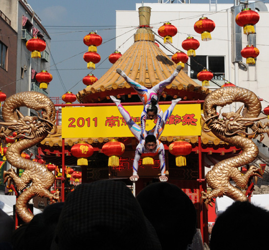 有著120多年歷史的神戶南京街在中國(guó)兔年春節(jié)來臨之際到處洋溢著節(jié)日的喜慶氣氛。南京街3個(gè)入口處張貼著“生意興隆 恭喜發(fā)財(cái)”的春聯(lián),沿街古色古香的建筑物上高掛著紅燈籠和寫有“春節(jié)祭”的彩條。街上游人如潮,一個(gè)不大的街心廣場(chǎng)上臨時(shí)搭建的舞臺(tái)周圍更是圍滿了觀眾。