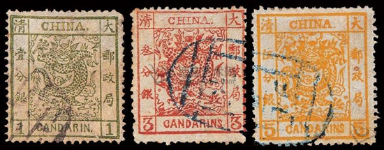 1878年清朝政府在北京、天津、上海、煙臺和牛莊(營口)等五處設立郵政機構,附屬于海關內,上海海關造冊處當年即以蟠龍為圖案印制了一套三枚郵票。郵票圖案正中繪一條五爪蟠龍,襯以云彩水浪,郵票的顏色和面值不同,面值用銀兩計算:“一分銀”(綠色,寄印刷品郵資)、“三分銀”(紅色,寄普通信函郵資)、“五分銀”(桔黃色,寄掛號郵資)。這是中國發行的第一套郵票,集郵界習慣稱其為“海關大龍”,簡稱“大龍郵票”。郵票上“大清郵政局”5個字十分醒目,圖案中的“大龍”兩目圓睜,騰云駕霧,呼之欲出。上方標有“CHINA(中國)”,下方標有“CANDARIN(S)(海關關平銀 分銀)”字樣。