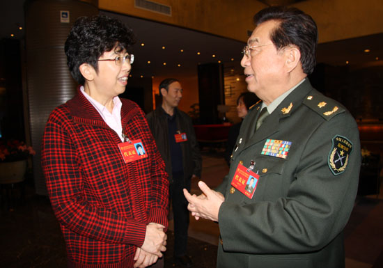 11月20日,中國文聯黨組書記、副主席趙實(左)在駐地與解放軍代表李雙江親切交談。中國文藝網 張悅 攝