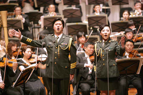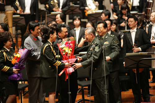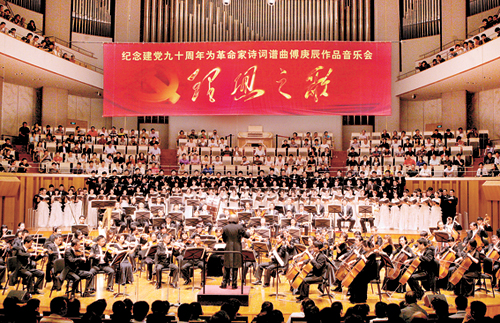 為向建黨90周年獻(xiàn)禮,5月23日,在毛澤東同志《在延安文藝座談會(huì)上的講話》發(fā)表69周年之際,由中國(guó)文聯(lián)、解放軍總政宣傳部、中華海外聯(lián)誼會(huì)、中國(guó)人民對(duì)外友好協(xié)會(huì)、中國(guó)音協(xié)主辦的“理想之歌——傅庚辰作品音樂會(huì)”在國(guó)家大劇院舉辦。全國(guó)政協(xié)副主席、中國(guó)文聯(lián)主席孫家正和中國(guó)文聯(lián)黨組書記趙實(shí),中國(guó)文聯(lián)黨組副書記、副主席李屹,中國(guó)文聯(lián)黨組成員、副主席廖奔,中國(guó)文聯(lián)黨組成員、書記處書記夏潮,中國(guó)文聯(lián)副主席丁蔭楠、白淑湘、劉蘭芳、李維康,中國(guó)音協(xié)名譽(yù)主席傅庚辰,主席趙季平,分黨組書記、駐會(huì)副主席徐沛東等出席了音樂會(huì)。