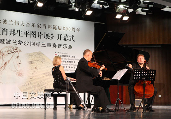 10月12日,由波蘭共和國駐華大使館、中國文聯(lián)和中國音協(xié)聯(lián)合主辦的《紀(jì)念波蘭偉大音樂家肖邦誕辰200周年——肖邦生平圖片展》在中國文藝家之家開幕。圖為波蘭華沙鋼琴三重奏小型音樂會。張大勇 攝