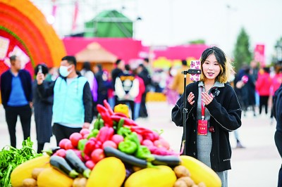 2022年9月19日,一位主播在內(nèi)蒙古“中國農(nóng)民豐收節(jié)”主會(huì)場(chǎng)進(jìn)行直播。新華社記者 彭源攝
