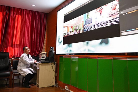 2024年12月17日,在青海省海南藏族自治州共和縣中醫(yī)院,醫(yī)生與鄉(xiāng)鎮(zhèn)衛(wèi)生院連線進行遠程會診。新華社記者 張龍 攝