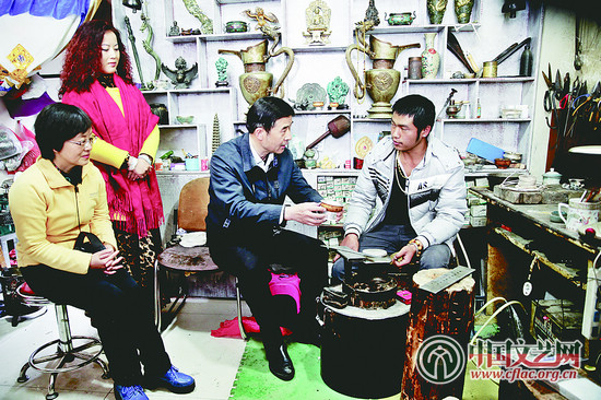 圖為中國民協(xié)分黨組書記、駐會副主席羅楊及志愿團(tuán)成員在工藝銀器制作坊與民間藝人交談。 白旭旻/圖