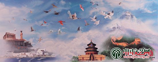 蘇繡巨作《和諧--百年奧運中華圓夢》集國畫、油畫、攝影等藝術元素于一體,對雅典衛城、北京天壇、長城、珠穆朗瑪峰等代表性景觀極其距離感、空間感及透視效果進行了重點刻畫。把一只只展翅飛翔的吉祥鳥,從靈動的眼睛到栩栩如生的羽毛繡得栩栩如生。用逐層加色、逐漸加深的技法著重地刻畫了天壇的鎦金寶頂、藍瓦紅柱,雅典衛城的美感。作品還正確處理了遠與近、動與靜、虛與實關系,其色彩比之繪畫更為豐富,由于有獨特的光線的折射效果,作品上的景物愈加生動,光彩動人。