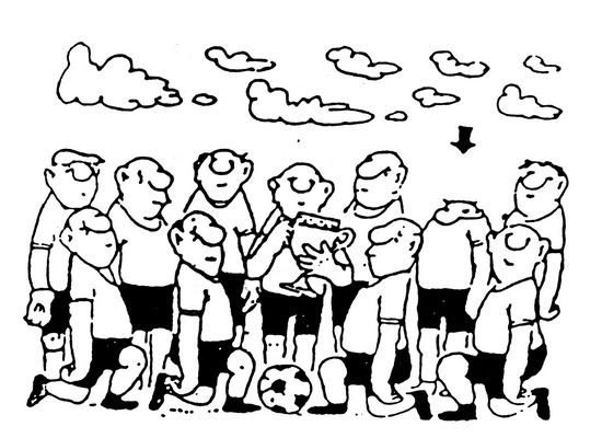 在大獲全勝后,藍(lán)天下綠茵場上足球隊(duì)員們列隊(duì)高舉獎杯留影,奇怪的是有位隊(duì)員卻看不見腦袋(箭頭指處),再看標(biāo)題《一個關(guān)鍵的頭球》,明白了!