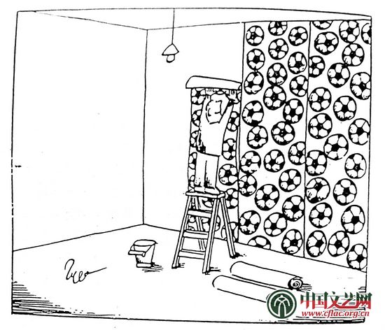 中國有句成語:情景交融,人的主觀感情往往需要與客觀景物相適應(yīng)相交融。抒情詩人會將屋內(nèi)布置得典雅清淡一些,而足球迷自然要布置得火爆一些,漫畫家準(zhǔn)確地掌握到球迷的心理,為球迷們設(shè)計(jì)了這樣鬧猛的墻紙,這正是這位漫畫家聯(lián)想思維和夸張手法的體現(xiàn),從生活中來刻畫球迷,別具一格。在藝術(shù)創(chuàng)作中往往不從正面描寫而從側(cè)面描寫更有獨(dú)到之處。
