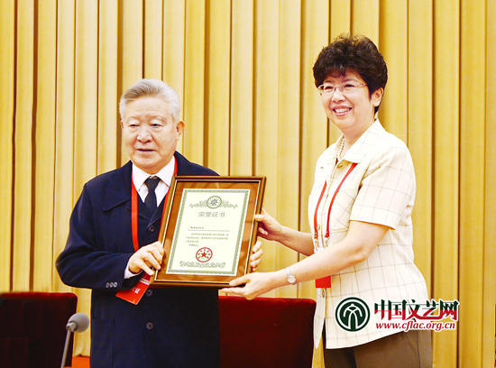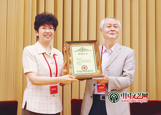 中國文聯黨組書記、副主席趙實為中國音協名譽主席傅庚辰(上圖)、趙季平頒發榮譽證書