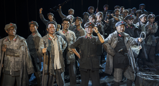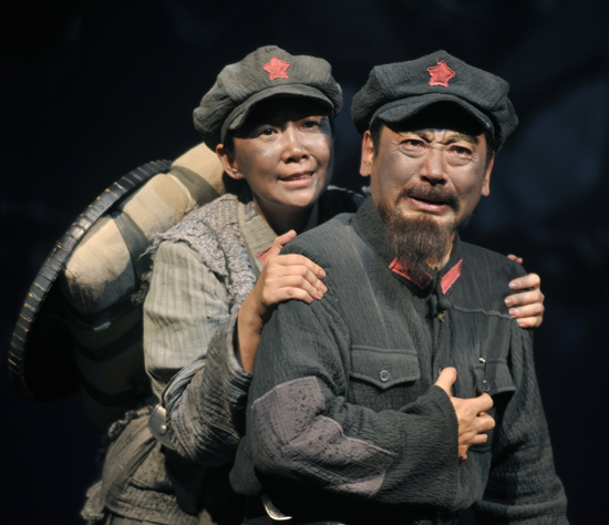 在藝術(shù)上,主創(chuàng)團隊也大膽突破傳統(tǒng)寫作模式,采用敘述體、史詩劇、思辨體戲劇相結(jié)合的全新戲劇結(jié)構(gòu),不采用相對單薄的單一化線性敘事結(jié)構(gòu),多點多線、塊面結(jié)合。劇中人物在演出進程中既是敘述主體,也是戲劇角色,在情境中展開戲劇行動。力求以寫人、表現(xiàn)人的情感世界為中心,全力塑造一批有血肉、有靈魂、有鮮明個性和豐富內(nèi)心世界的人物。當(dāng)年的民歌、舞蹈、風(fēng)土人情、民俗文化,以及毛澤東同志的長征詩詞等也被化入劇中。