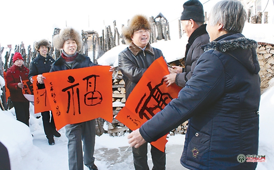 2015年1月21日,“萬福進(jìn)萬家 送福到林家”——黑龍江省文聯(lián)、省書協(xié)文藝志愿服務(wù)團(tuán)“送萬福進(jìn)萬家”走進(jìn)威虎山雪村