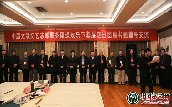 中國文聯黨組書記、副主席趙實,中國文聯黨組成員、副主席李前光與書法家、美術家向固原人民贈送書法和美術作品。中國文藝網 周春桃 攝