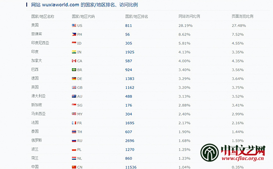 北美中國網(wǎng)文翻譯網(wǎng)站W(wǎng)uxiaworld(武俠世界)擁有“百萬級(jí)老外讀者”已經(jīng)不是新聞。自2014年12月建站至今兩年多,已迅速躥升為全球Alexa排名954的網(wǎng)站(2017年4月7日Alexa統(tǒng)計(jì)數(shù)據(jù)),日均獨(dú)立訪問者達(dá)97.92萬,日均頁面瀏覽量達(dá)1449.22萬,在全球綜合排名遠(yuǎn)遠(yuǎn)超過了建立近20年的中文網(wǎng)絡(luò)文學(xué)網(wǎng)站“起點(diǎn)中文網(wǎng)”(2017年4月7日Alexa排名為16128)。約1/3的訪問用戶來自美國,其他用戶來自菲律賓、印度尼西亞、印度、加拿大、巴西、德國、英國、澳大利亞、新加坡、馬來西亞、法國、泰國、俄羅斯等近百個(gè)國家。