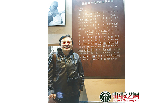 王興東在西柏坡紀念館中的《沒有共產黨就沒有新中國》歌譜前留影
