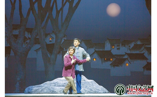 矛盾鬧得正不可開交,母親出場了,本已聾了的她不僅聽到哥倆吵,甚至聽到之前向農(nóng)夫妻有意避開她的竊竊私語,兒媳怨責兒子不抓緊時間看病,斥責向中不該這樣對待患癌癥晚期的哥哥。向農(nóng)大驚,責備妻子說話不小心,向中則痛罵自己不懂事,撇開往事,決心砸鍋賣鐵也要送哥哥去醫(yī)院。這中間有一段向母踉蹌奔出、激情演唱西皮導板轉(zhuǎn)原板的老旦唱腔,歷數(shù)向農(nóng)多年來為村民作了多少好事難事而積勞成疾,唱出對兒子的痛惜之情。這樣的唱,集中唱情,而且唱得是地方,恰當利用了傳統(tǒng)的行當和京劇唱腔板式與調(diào)性的程式。戲只進到第三場,便造成全劇起承轉(zhuǎn)合的第一次高潮,掀起感情的風暴,催人淚下,邀人激賞。