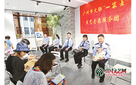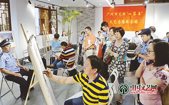 在廣州文藝市民空間二樓的嶺南活力非遺藝術館,幾十位廣州藝術家志愿者忙得熱火朝天,書法家現場揮毫,畫家和漫畫家為干警們畫像,攝影家為干警拍肖像,剪紙藝術家則為干警肖像剪紙……