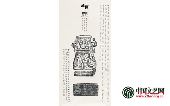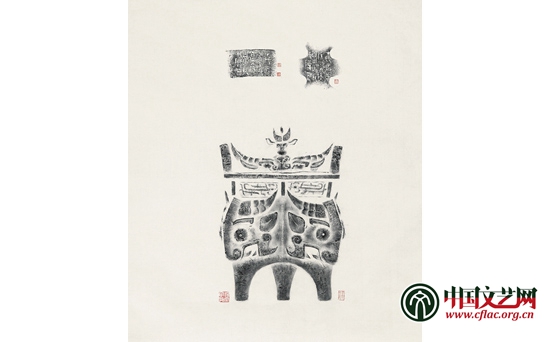 周希丁的弟子傅大卣繼承了他全形拓的技藝,而賈文忠正是師從于傅大卣的傳承人。自幼受家庭熏陶酷愛金石書畫的賈文忠十幾歲即隨父習業,深得銅器修復要領,又拜康殷、傅大卣等為師,學習金石篆刻、書畫、鑒定。他先后在北京市文物局、首都博物館、中國農業博物館從事文物保護、修復、鑒定、研究等工作近40年,修復過數千件青銅器,鑒定青銅器不計其數,其中不乏國寶重器,這使他有機會創作全形拓,并在全形拓基礎上潛心研究穎拓技藝。據他介紹,當代青銅器全形拓的拓法是在拓器物前,選擇最能代表該器物特征的最佳角度,用鉛筆在準備好的棉連紙上畫出一個“⊥”形圖,以表示器物的垂直線和水平線,再在“⊥”形圖上標出器物的高度、寬度為基礎,畫出被傳拓器物原大的線描圖,隨后把標有器物各部位位置的棉連紙分先后覆在被拓器物上,用蘸有白芨水的毛筆刷濕,上紙,用棕刷刷實,用墨拓黑后揭下,這樣多次拓完器物的各個部位,完成全形拓。他采用了古人傳統全形拓方法,所拓器物全形準確與實物不二,透視合理,紋飾清晰、絲絲入扣、銘文規范、筆畫有序、效果逼真、賞心悅目,作品更邀請多位藝術家為之補繪或題跋,既充分展現了傳統技藝之美,又有當代文化的介入,文質兼備。