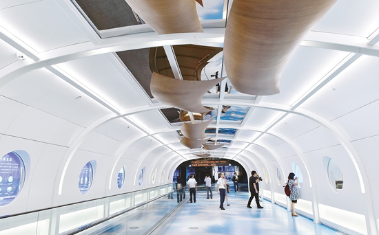 廣州白云國際機場與廣東省博物館合作打造的大型“絲路主題”公共藝術空間、大型歷史文化長廊——“海天走廊”日前正式開通迎客。該通道全長200米、面積約3300平方米。首期開設“牽星過洋——廣州海貿傳奇”主題展覽,講述廣州作為“海上絲綢之路”發祥地之一的貿易歷史,展品包括跨越唐、宋、明、清代的特色瓷器、銀飾品等。圖為觀眾在“海天走廊”觀看“海上絲綢之路”展覽。