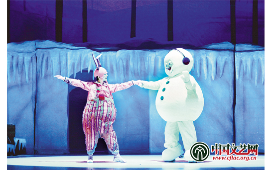 因為《雪孩子》的故事比較簡單,為了適合在舞臺上呈現,作品在內容上進行了深度拓展,增加了雪孩子的家——雪宮殿,以及雪孩子的媽媽雪女王等角色。同時,情節也更加豐富:作為雪女王兒子的雪王子,帶著對母親的承諾來到小兔一家身邊。當他看到大雪覆蓋下的生靈面臨危險時,責任感油然而生。通過與松樹、翠鳥、小松鼠和小兔的相遇,雪孩子體味到了幫助別人的快樂,并且收獲了真正的友誼。