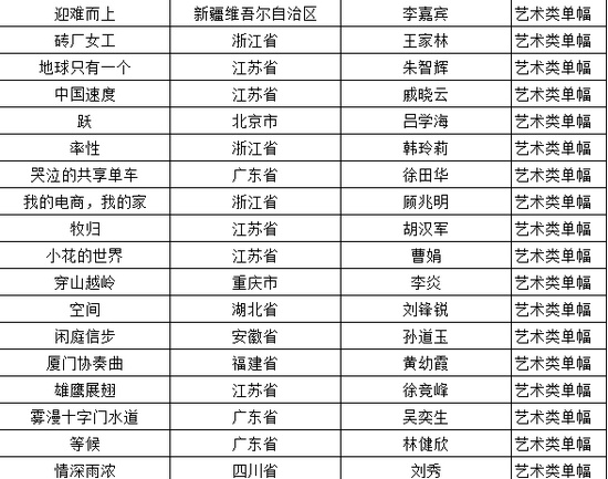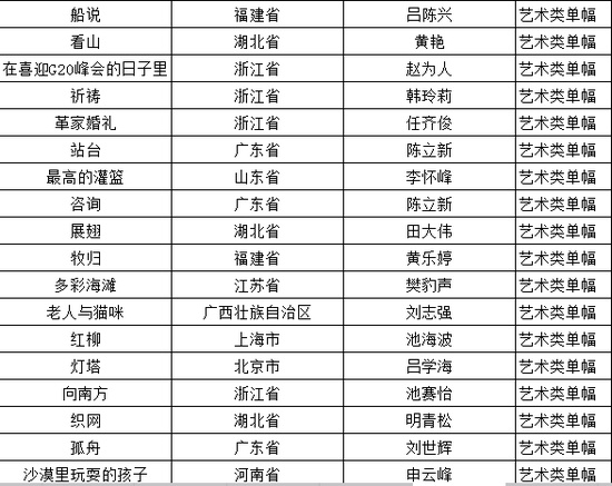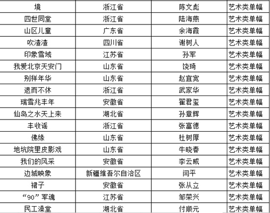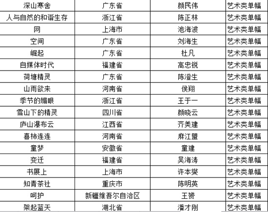 經(jīng)公示和核查鑒定等程序后,本屆全國攝影藝術(shù)展覽產(chǎn)生入選作品379件,其中紀(jì)錄類作品131件(單幅77件、組照54件),藝術(shù)類作品168件(單幅99件、組照69件),商業(yè)類作品60件(單幅35件、組照25件),多媒體類作品20件。