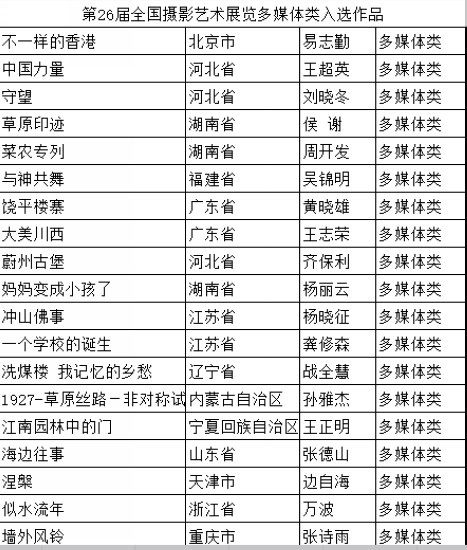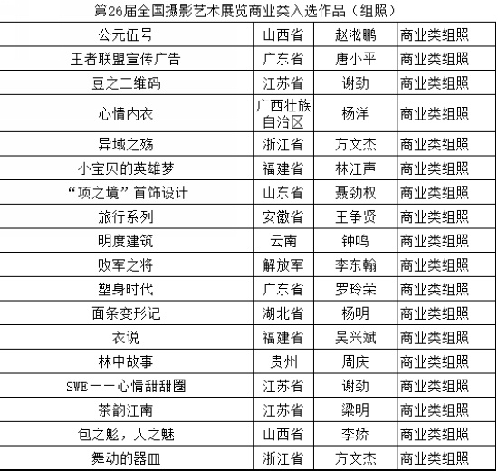 中國文學(xué)藝術(shù)界聯(lián)合會、中國攝影家協(xié)會主辦的第26屆全國攝影藝術(shù)展覽,收到來稿作品94273件(212065幅),其中:紀(jì)錄類作品53842件,藝術(shù)類作品38275件,商業(yè)類作品1954件,多媒體類作品202件。本屆全國攝影藝術(shù)展覽經(jīng)過初評、終評選出擬入選作品418件。