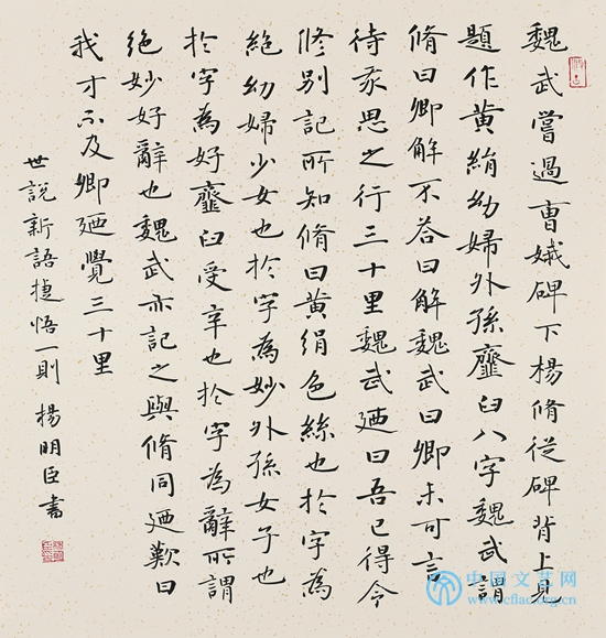 在對時代特點和字體特殊性有如此清晰認識的前提下,楊明臣仍然選擇小楷作為主攻方向,顯示了巨大的勇氣和堅卓的毅力。能夠從千軍萬馬中走出自己的道路,成為當下小楷書法的代表性人物之一,他的付出是可想而知的。他在《小楷的格調》中寫道:“往往需要積十年、數十年之功才能稍顯個人面貌。”這句話與其說是在勸告讀者不可“妄取捷徑”,不如說是他的自況。若無超越常人的艱苦磨礪,他作品中那得古法之妙而又融入我意、我法、我情、我趣的高超技術,是斷斷不可能實現的。