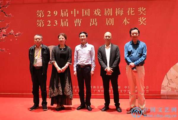 4月26日,第29屆中國戲劇梅花獎和第23屆曹禺劇本獎在廣西南寧頒獎。圖為榮獲第23屆曹禺劇本獎的編劇曹憲成、王羚、陳明、馮俐、步川(任永新)在紅毯合影。中國文藝網 郝紅霞 攝