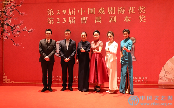 4月26日,第29屆中國戲劇梅花獎和第23屆曹禺劇本獎在廣西南寧頒獎。圖為榮獲第29屆中國戲劇梅花獎的戲曲類獲獎演員單雯、張歡、陳麗宇、蔡浙飛、李小青、傅希如在紅毯合影。中國文藝網 郝紅霞 攝
