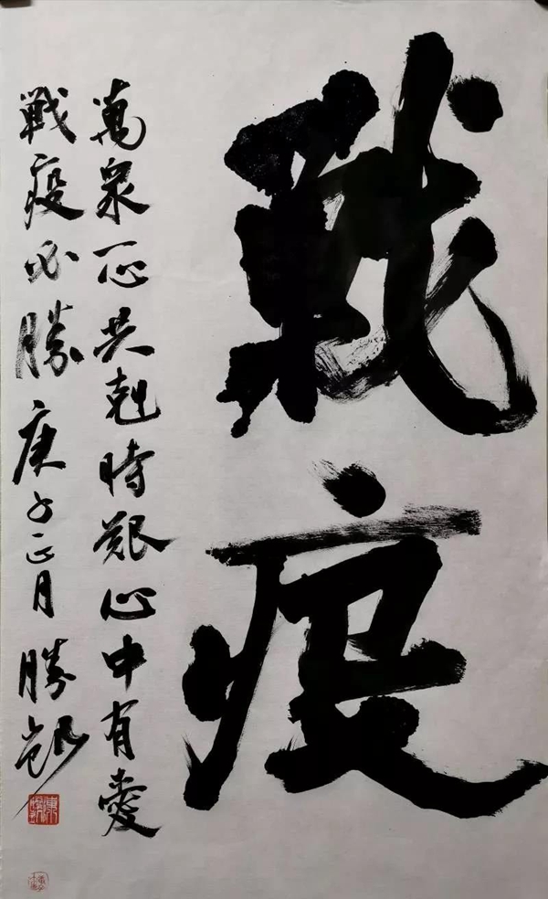 釋文:戰(zhàn)疫——萬眾一心,共克時艱,心中有愛,戰(zhàn)疫必勝。