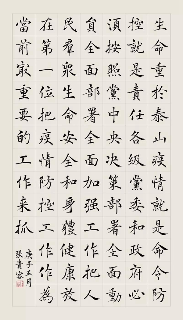 釋文:生命重于泰山。疫情就是命令,防控就是責任。各級黨委和政府必須按照黨中央決策部署,全面動員,全面部署,全面加強工作,把人民群眾生命安全和身體健康放在第一位,把疫情防控工作作為當前最重要的工作來抓。