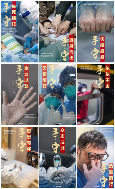由人民日報新媒體刊發(fā)的一組攝影作品《一線抗疫人員的手》,讓人震撼和淚目。這組攝影作品由9幅以醫(yī)務(wù)人員的“手”為主題的圖片組成,每一張圖片都是一個動人的故事。《生死相托》講護(hù)士長馬晶握住因害怕而流淚的一位老年患者的手安慰她:“可以治愈的,我們一直都陪著你”;《挺身而出》講石家莊第九八〇醫(yī)院白求恩醫(yī)療隊(duì)60余名隊(duì)員寫下請戰(zhàn)書,要求奔赴武漢抗疫一線;《傷痕累累》講22歲感染科護(hù)士胡佩英因長期受消毒液和酒精浸泡而被侵蝕得傷痕累累的手;《全力以赴》講28歲的王濤下夜班后脫下防護(hù)服和口罩,露出被汗水浸得皺巴巴的手;《無懼前行》講海軍軍醫(yī)大學(xué)醫(yī)療隊(duì)重癥監(jiān)護(hù)室醫(yī)護(hù)人員在工作間歇豎起拇指為自己鼓勁打氣;《依依不舍》講上海奉賢區(qū)中心醫(yī)院吳玲在大年初三與丈夫依依揮別走向抗“疫”前線;《感恩有你》講一位小患者舉起小手給武漢同濟(jì)醫(yī)院兒科急診臨床護(hù)士鮑翠芳比了一個大大的心;《眾志成城》講武漢協(xié)和醫(yī)院的醫(yī)生們緊握彼此的手互相加油鼓勁;《負(fù)重前行》講武漢肺科醫(yī)院ICU主任胡明得知同行好友感染病危而泣不成聲,用手抹干眼淚后繼續(xù)救治病人。這組攝影作品無聲卻感人,“于細(xì)微處見真情”,正是這樣一雙雙普通而平凡的手為全國人民筑起抗擊疫情的鋼鐵長城。攝影人有情懷,作品才有力量。