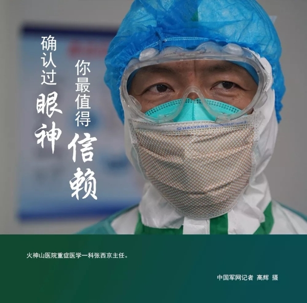 中國軍網(wǎng)記者高輝在火神山醫(yī)院重癥醫(yī)學(xué)一科拍攝時,感慨地說:“沒有穿上防護(hù),體會不到醫(yī)護(hù)人員們的感受,也沒有辦法拍出好作品,只有感同身受,才知道穿上那么難受,才知道患者除了用藥最需要什么,最后我發(fā)現(xiàn)了眼睛,因?yàn)槁曇襞牟怀鰜恚晕疫x擇眼睛,抓拍眼神。”于是,就有了一組關(guān)于醫(yī)護(hù)人員“眼神”的特寫,“用影像幫患者們記住他們的眼睛,讓所有人記住那一雙雙堅(jiān)毅的眼神!”每一位醫(yī)護(hù)人員,都值得我們行注目禮。確認(rèn)過眼神,他們是患者最信賴的人!