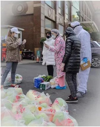 社區工作者正在給武漢市民送菜