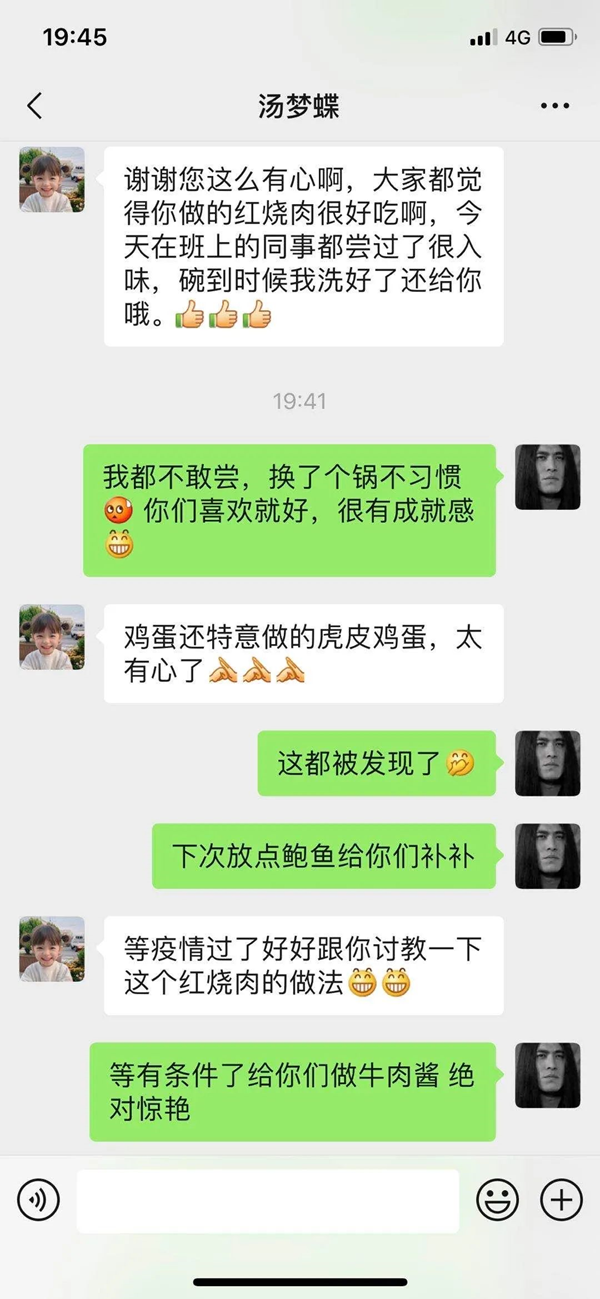 與蔡柳柳一樣,武漢市文聯所屬事業單位武漢美術館的黨員代楷,在下沉的江漢區常青街富豪社區也接到了與醫護人員一對一幫扶的任務,他幫扶的對象是中心醫院耳鼻喉科的湯夢蝶醫生。自家種的菜薹、超市新鮮購買的肉和水果、面粉、酵母,代楷幾乎把自己能搜羅到的好東西都送到了湯醫生手上。考慮到湯醫生和同事在醫院工作辛苦,代楷還利用休息時間,在家做了一大盤虎皮雞蛋紅燒肉,送到醫院給湯醫生和同事改善伙食,精心烹制的味道讓耳鼻喉科的醫護人大呼“驚艷”。受到鼓舞,代楷又多次在完成社區日常工作后,回家變著花樣燒菜,給湯醫生他們送宵夜。“只要他們吃得開心,我就滿足了。”