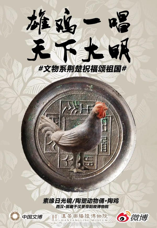 彩繪雄雞長16.4厘米、高14.4厘米,為灰陶質,通體彩繪。素緣日光鏡直徑6.85厘米。背面無銹飾,為水銀光,弓形鈕,方座,方座四面以凸線構成的對稱長方形分布,共有“見日之光,天下大明”八字銘文。“雄雞一唱”意味著天明,象征黑暗離去,“天下大明”。愿戰疫早日勝利,所有人都平平安安。