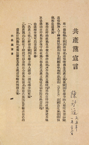1919年底,陳望道受上海《星期評(píng)論》之約,翻譯《共產(chǎn)黨宣言》。他參照英文版、依從日文版《共產(chǎn)黨宣言》,于1920年3月、4月間完成了這部經(jīng)典巨著的翻譯,譯稿又經(jīng)陳獨(dú)秀、李漢俊校對(duì)。但由于《星期評(píng)論》已停刊,發(fā)表宣言遇到困難。不久,上海的早期共產(chǎn)黨組織決定用“社會(huì)主義研究社”的名義將其出版。1920年8月,在共產(chǎn)國(guó)際代表維經(jīng)斯基等人的資助下,陳望道所譯《共產(chǎn)黨宣言》第一個(gè)中文全譯本誕生于上海共產(chǎn)主義小組的又新印刷所。《共產(chǎn)黨宣言》中文全譯本在中國(guó)的出版具有劃時(shí)代的意義,它直接影響了毛澤東、周恩來、鄧小平等老一代無產(chǎn)階級(jí)革命家樹立對(duì)馬克思主義的信仰,對(duì)中國(guó)革命和歷史進(jìn)程產(chǎn)生了深遠(yuǎn)的影響。