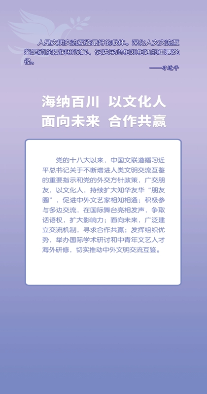 新時代賦予新使命,新使命呼喚新擔當。中國文聯將繼續團結引領廣大文藝工作者緊密團結在以習近平同志為核心的黨中央周圍,同心同德、群策群力,不忘初心、砥礪奮進,不斷推動對外和對港澳臺工作邁上新的臺階,為實現中華民族偉大復興的中國夢貢獻力量。