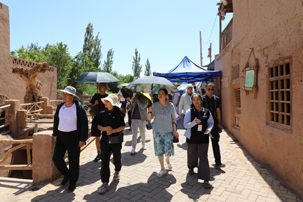 采風團深入體驗新疆當地人的普通生活,途經葡萄溝、坎兒井民俗村、吐峪溝麻扎村、國際大巴扎、西部烏鎮等地,品味到了新疆最真實感人的生活味道,參觀了新疆地域特色生土民居,欣賞了熱烈奔放的新疆歌舞,品嘗了新疆美食和香甜瓜果,回味“甜甜的事業”,感受到了新疆人民純樸善良的性格。大家被當地熱情好客的氛圍所感染,有的團員更是與當地居民共彈一首曲、共跳一支舞,成為文化交融、文明互鑒的生動注腳,深刻認識到多民族聚居、多宗教并存的新疆,生活是如此甜蜜。新疆各族人民同全國人民一道,用勤勞智慧的汗水,共同締造了多元一體的中華民族大家庭,各民族就像石榴籽一樣緊緊地抱在一起。國外團員們表示,不同民族的人和諧相處,共同生活工作在一起,令人感動。可以想象,千百年前的古代絲綢之路又是怎樣的輝煌繁榮。