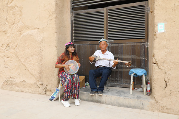 國外團員同當地維吾爾族老人共同演奏手鼓和熱瓦甫