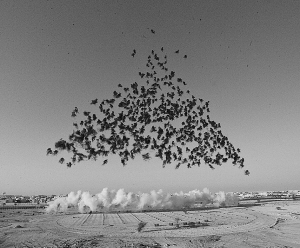蔡國強最為拿手的爆炸秀首次放到了白天的自然環境中舉行,而且煙火的色彩采用了前所未有的黑色。爆炸秀的名稱為“黑色儀式”。卡塔爾的王公貴族、平民百姓以及來自世界各地的嘉賓和媒體記者一起在一片被平整過的寬闊地域觀看了爆炸。這場秀約有6組不同形式的爆炸。在劇烈的爆破聲中,無數黑色的煙火直沖碧空,形成巨大的環形、金字塔形等。黑霧散開時,如朵朵水墨暈化在藍天。其中有一組僅僅是一團極速騰空而起的烈焰,熱浪撲面,非常震撼。也有一組的焰火是粉紅、粉綠、粉藍的青春色彩。現場觀眾激動的呼喊聲此起彼伏。這場爆炸秀以迅雷不及掩耳的氣勢,讓觀眾體會著蒼涼、神秘、暴烈和絢爛。蔡國強說,這個以“葬禮”為核心內容的藝術展給死在異鄉的還鄉者一個精神葬禮。
