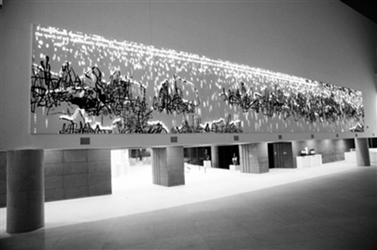 潘公凱2011年威尼斯雙年展中國(guó)館的作品《融》,以水墨為背景,電子媒介的使用讓作品從遠(yuǎn)處看像下雪一樣。 今日美術(shù)館供圖