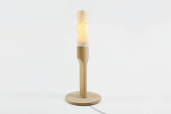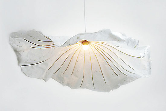 從糊傘的工藝中得到啟發(fā),繼續(xù)向前進(jìn)化,設(shè)計(jì)出這盞臺燈。應(yīng)用皮紙和天然漿糊
